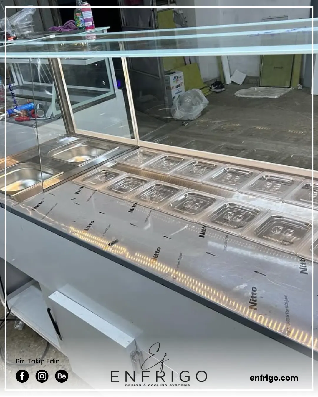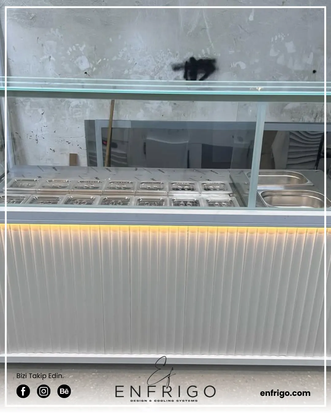Çiğ köfte dolabı, çiğ köftelerin taze ve hijyenik şekilde saklanmasını sağlayan özel bir soğutmalı teşhir dolabıdır. Paslanmaz çelik gövdesi ile dayanıklı ve kolay temizlenebilir bir yapı sunar. Şeffaf cam kapakları sayesinde içeriye rahatça göz atılabilir, bu da müşteriler için çekici bir sunum sağlar. Güçlü soğutma sistemi, çiğ köftenin taze kalmasını ve hijyenik koşullarda muhafaza edilmesini garanti eder. Hem soğutmalı hem de estetik açıdan etkileyici olan bu dolap, çiğ köfte dükkanları, fast food restoranları ve büfeler için idealdir.
