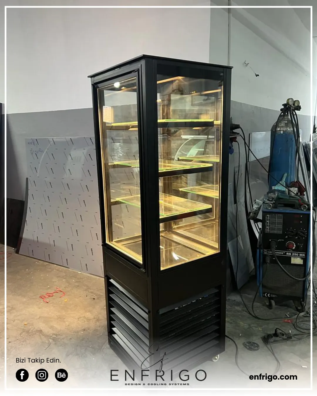 Dikey pasta teşhir dolabı, sınırlı alanlarda bile şık ve verimli bir sergileme çözümü sunar. Paslanmaz çelik gövdesi, dayanıklı ve hijyenik bir kullanım sağlar. Camlı tasarımı sayesinde pastalar ve tatlılar net bir şekilde görünür, bu da görsel çekiciliği artırır. Güçlü soğutma sistemi, pastaların ideal sıcaklıkta kalmasını sağlarken, LED aydınlatma ürünlerin daha dikkat çekici olmasını sağlar. Şık ve kompakt yapısı, mekanınıza zarif bir dokunuş katarken, alan kullanımını da optimize eder.