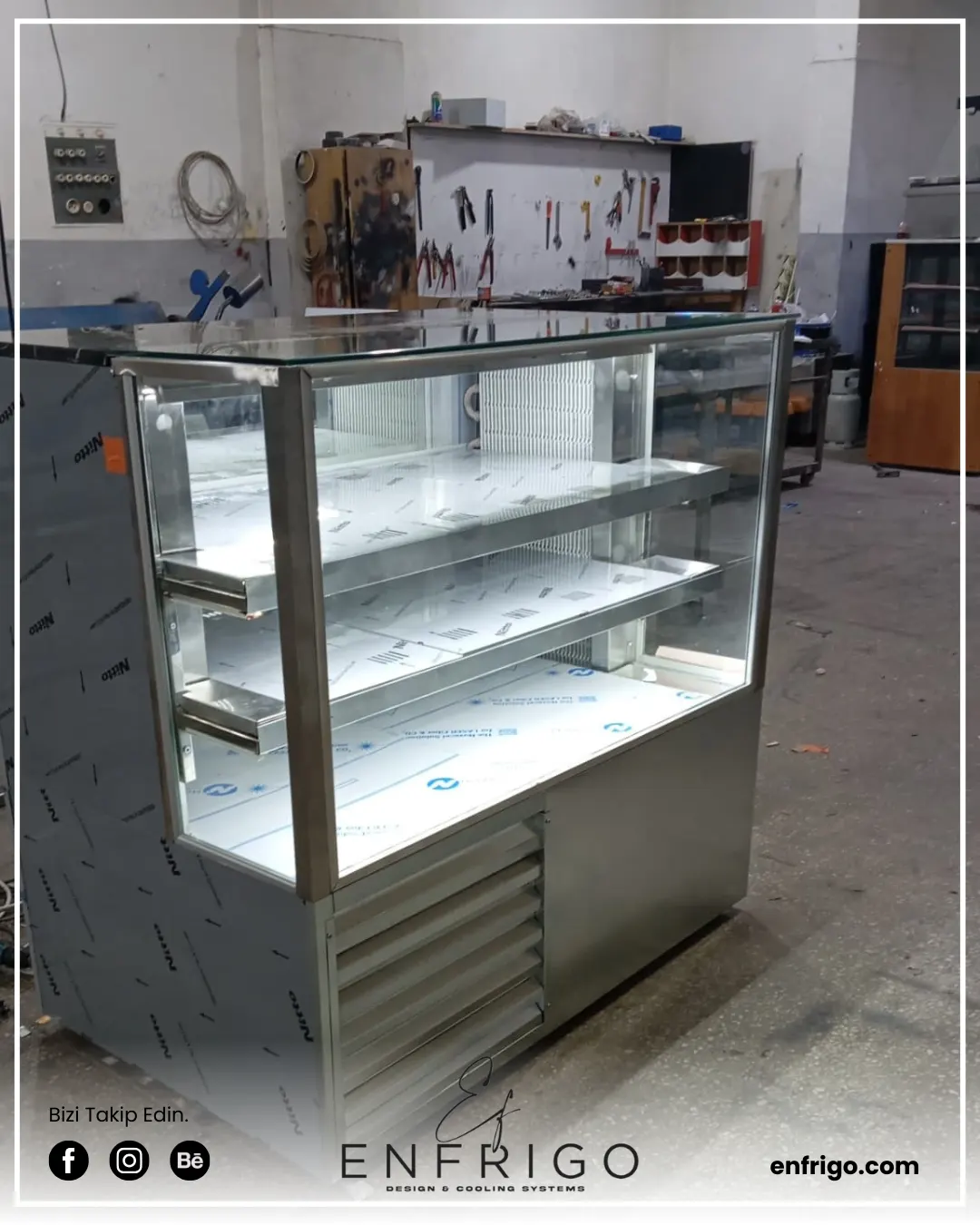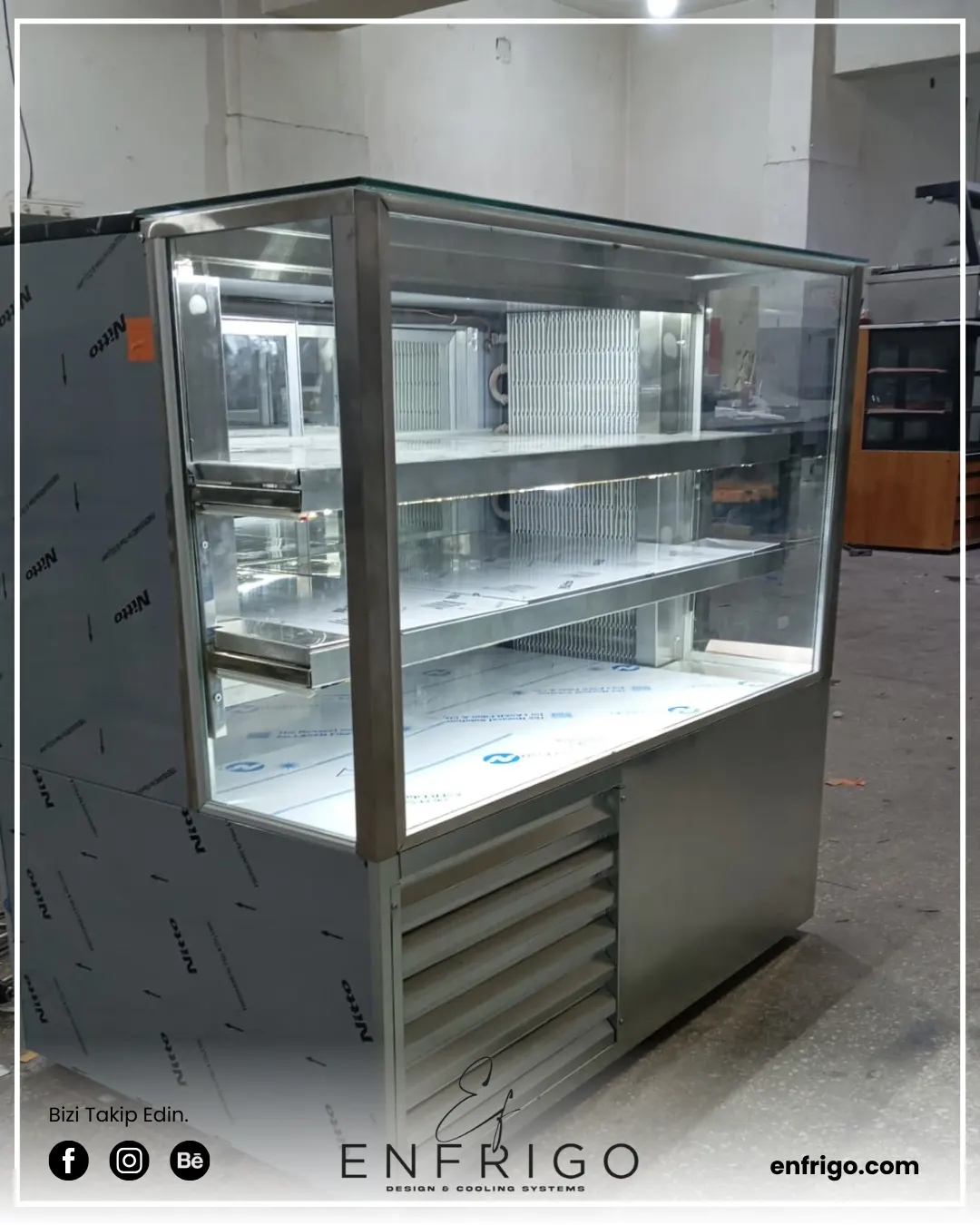 Pasta dolabı meze dolabı, pasta ve mezeleri taze tutarken şık bir şekilde sergileyebilmek için özel olarak tasarlanmıştır. Paslanmaz çelik gövdesi ve geniş cam panelleri ile ürünler net bir şekilde gösterilir, bu da görsel çekiciliği artırır. Güçlü soğutma sistemi sayesinde pasta ve mezelerin ideal sıcaklıkta muhafaza edilmesini sağlar. LED aydınlatma ile ürünlerin daha dikkat çekici hale getirilmesi sağlanır. Bu dolap, hem estetik hem de fonksiyonel olarak mükemmel bir çözüm sunar.